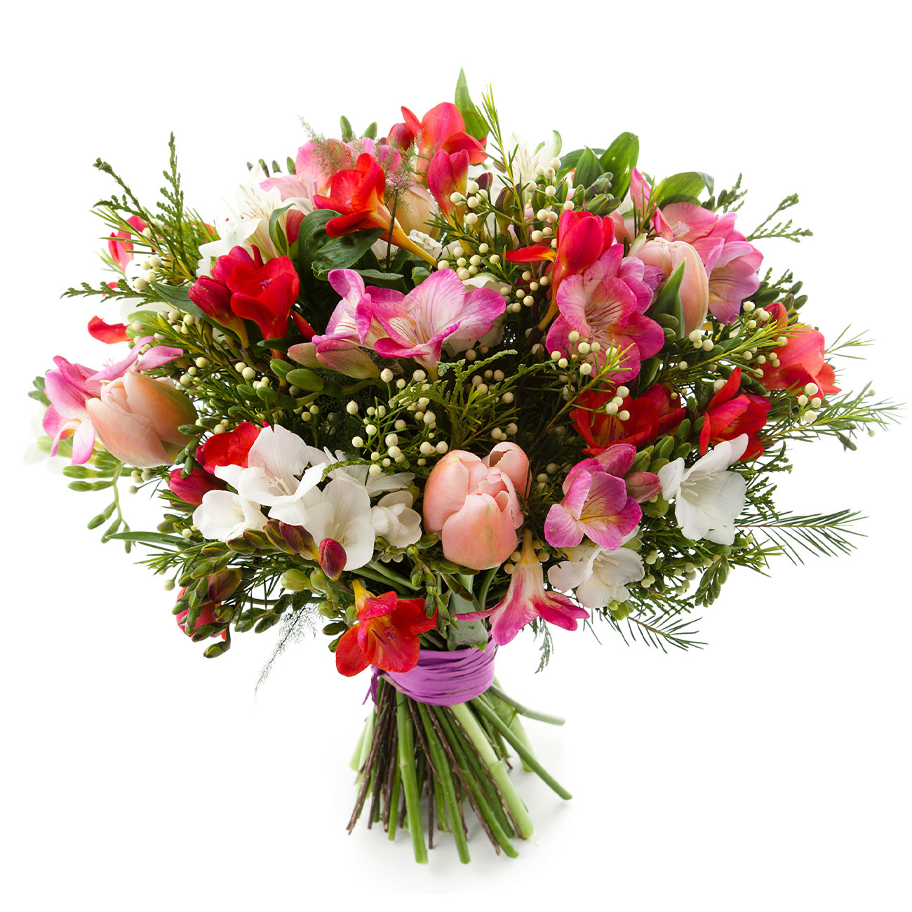 Фрезия розовая, красная и белая, тюльпан персиковый, гиперикум, зелень. Упаковка (лента, пленка, крафт, сетка, пленка матовая)