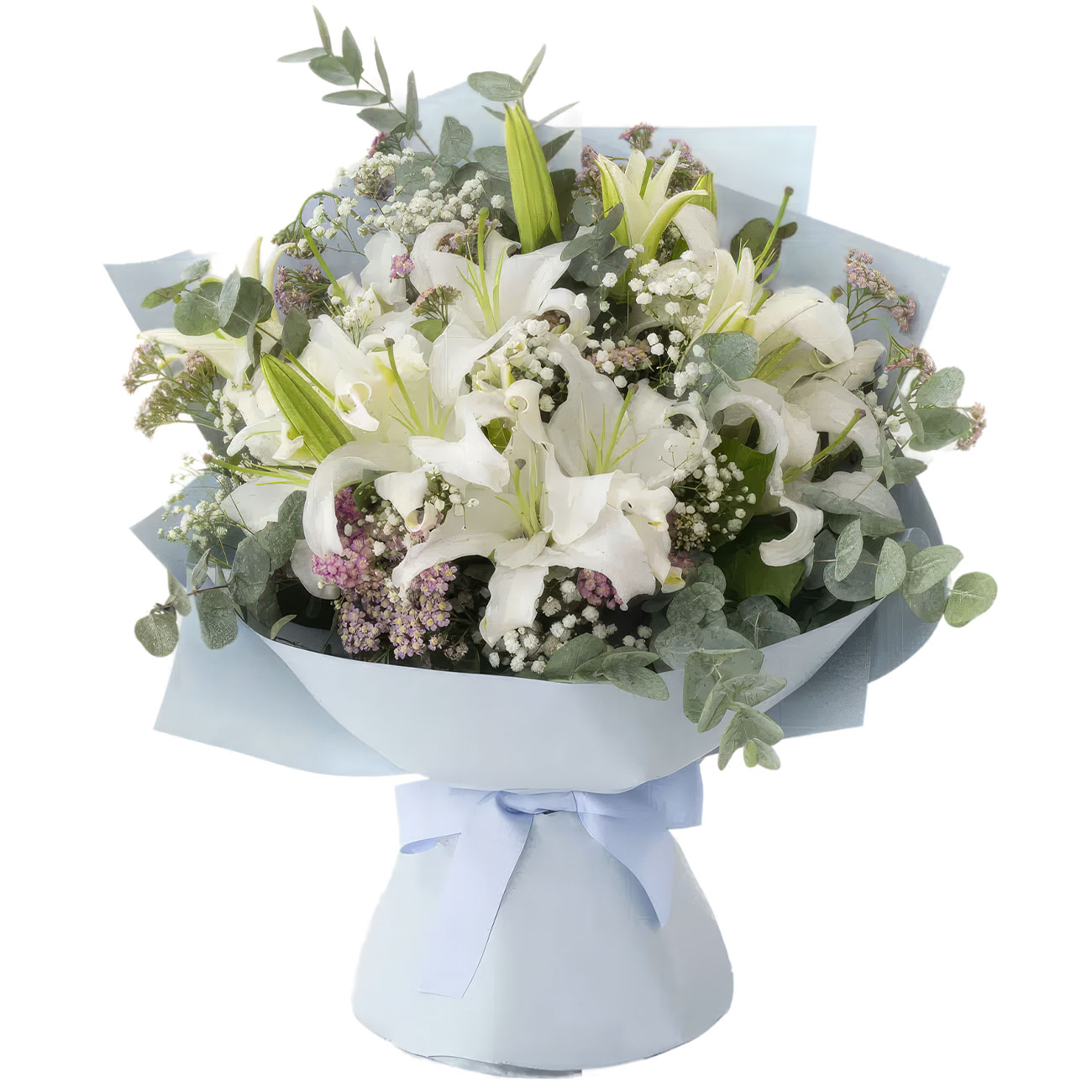 Лилия белая, гипсофила, эвкалипт. Упаковка (лента, пленка, крафт, сетка, пленка матовая)