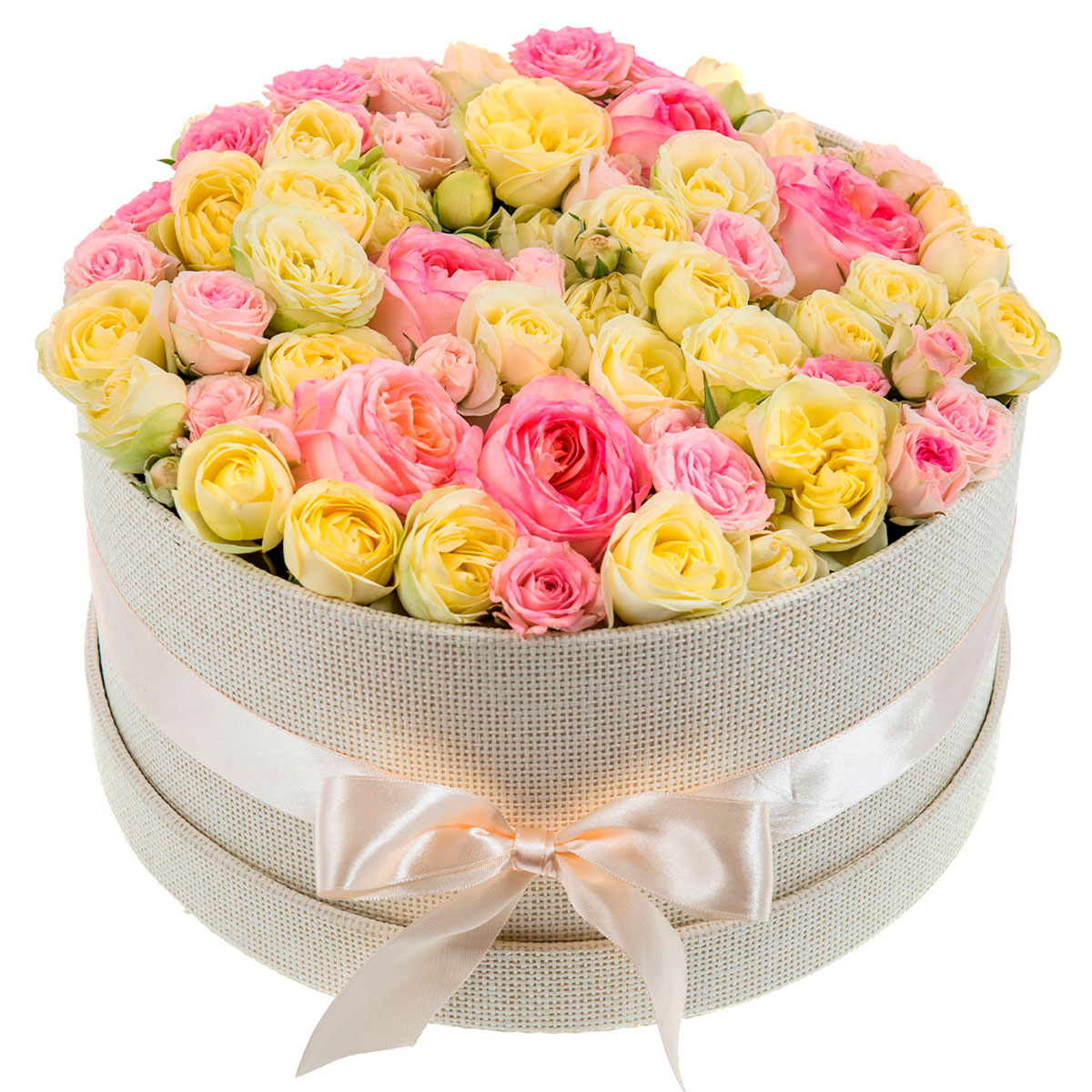 Роза одноголовая розовая, роза кустовая пионовидная желтая, роза кустовая розовая. Упаковка (шляпная коробка, квадратный бокс, коробка сердце, оазис)